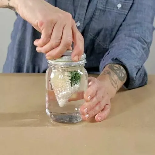 Před umístěním víčka na sklenici naneste vodotěsné lepidlo kolem okraje sklenice. Nasaďte víko a pevně jej přišroubujte. Nechte sestavenou sněhovou kouli ze sklenice přes noc schnout dnem vzhůru. Jakmile uschne, otočte jej pravou stranou nahoru, protřepejte a užívejte si!