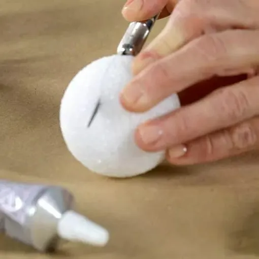 Rozřízněte malou bílou pěnovou kouli na polovinu a poté odstraňte část vršku tak, aby byly oba povrchy rovné a okraje byly zaoblené. Ujistěte se, že průměr kousku pěny je dostatečně malý, abyste mohli přišroubovat víko. Připevněte pěnu dovnitř víka pomocí voděodolného lepidla a nechte zaschnout. To vám umožní zajistit postavy a stromy uvnitř sněhové koule z nádoby.