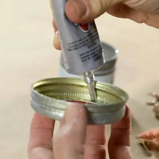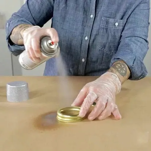 Sejměte víko ze skleněné nádoby. Oddělte dva díly víka a položte je lícem nahoru na rovný povrch. Části víčka nastříkejte třpytivou barvou ve spreji. Na fotografii použili sprej s jemným zlatým třpytem, ale můžete si vybrat libovolnou barvu nebo nechat víko hladké pro vánoční řemeslo v zimním domácím stylu.