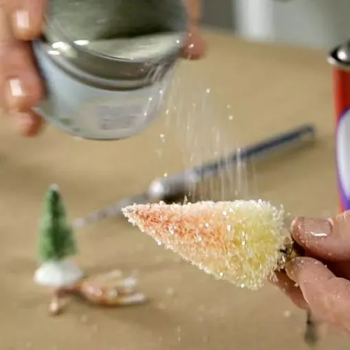 Co jsou vánoční řemesla bez jiskry a jiskry? Přidejte třpytky (možná ve formě kovových hvězd, pokud je najdete) na postavy, stromy nebo okraje fotografií pomocí lepidla ve spreji. Jednoduše nastříkejte na předměty a navrch nasypte třpytky a otočte figurku tak, aby byla pokryta ze všech stran. Pomocí voděodolného lepidla připevněte miniatury nebo fotografie k pěně na vnitřní straně víka zavařovací sklenice. Nechte přes noc zaschnout.