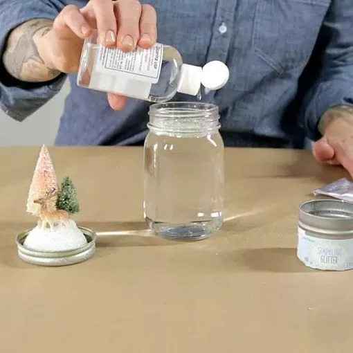 Naplňte sklenici destilovanou vodou, třpytkami a několika kapkami glycerinu. Glycerin suspenduje třpytky ve vodě a vytváří magický sněhový efekt. Působí také jako konzervační prostředek, aby byly vaše figurky (nebo fotografie) v bezpečí a zdravé.